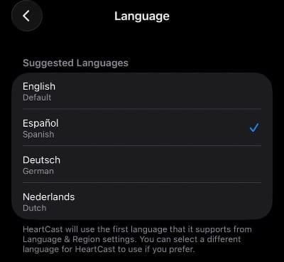 HeartCast will display in your chosen language while the rest of your device stays in its current language.
